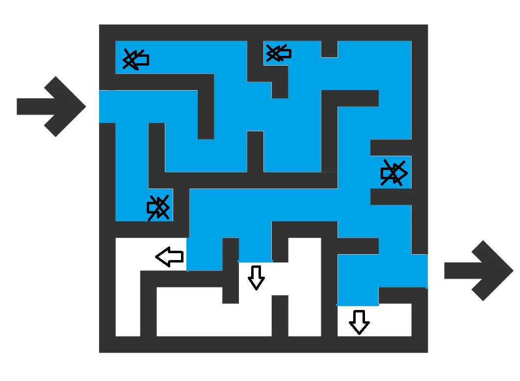 在入口处浇水,水流遇到岔路会分成多股同时走,最终总有一股水流能到终点。