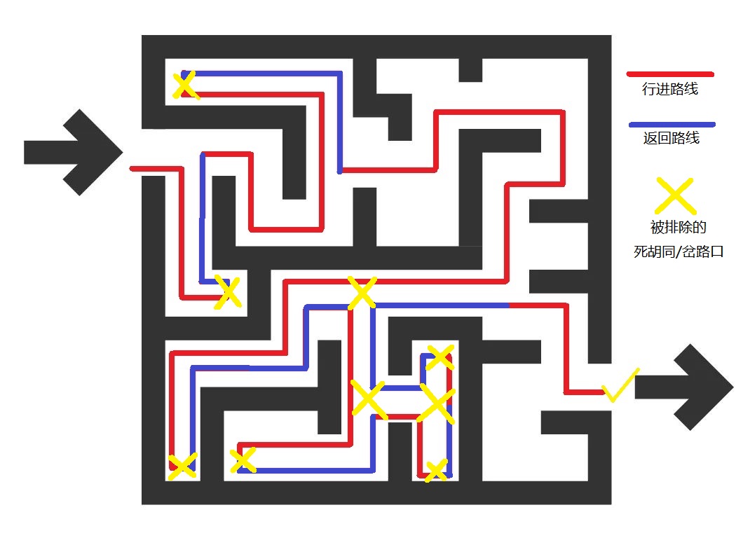 如果走到死胡同就原路返回到之前走过的岔路口走其他岔路,