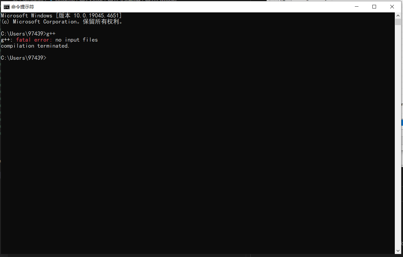 确定加进去后,进入命令提示符,输入 g++ 并回车,此时系统会根据环境变量直接调用 g++.exe,