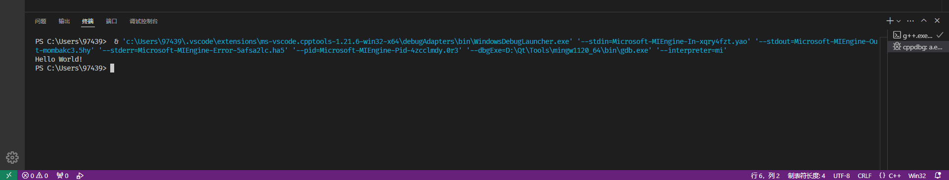 第一次运行会先跳到终端然后跳到调试控制台,我们转回终端,就能看到程序的输出: