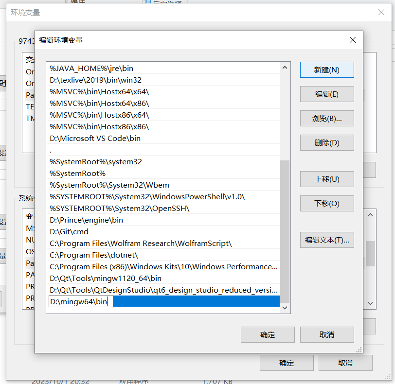 双击系统变量 Path,然后把 MinGW-w64 的 bin 文件夹的路径加进去: