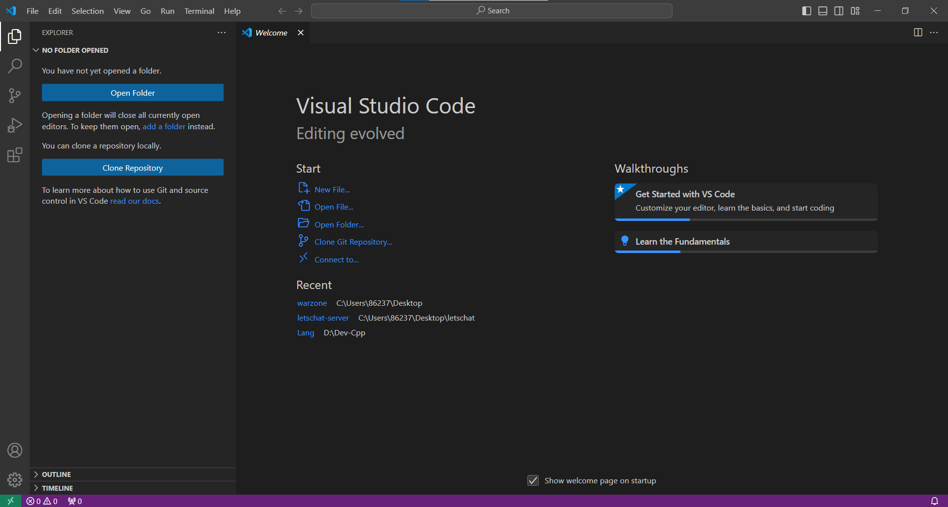 第一次打开 VScode,映入眼帘的应该是与下图类似的页面: