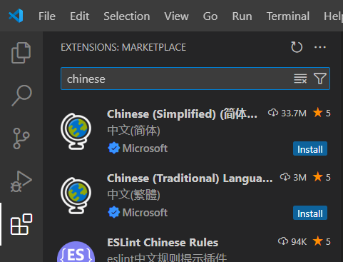 在搜索框中搜索 chinese,搜索结果的第一个就是 vscode 的简体中文插件:
