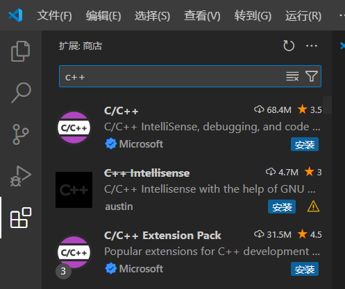 例如,若要配置 c++,我们需要安装微软的 C/C++ 插件(下图第一个)