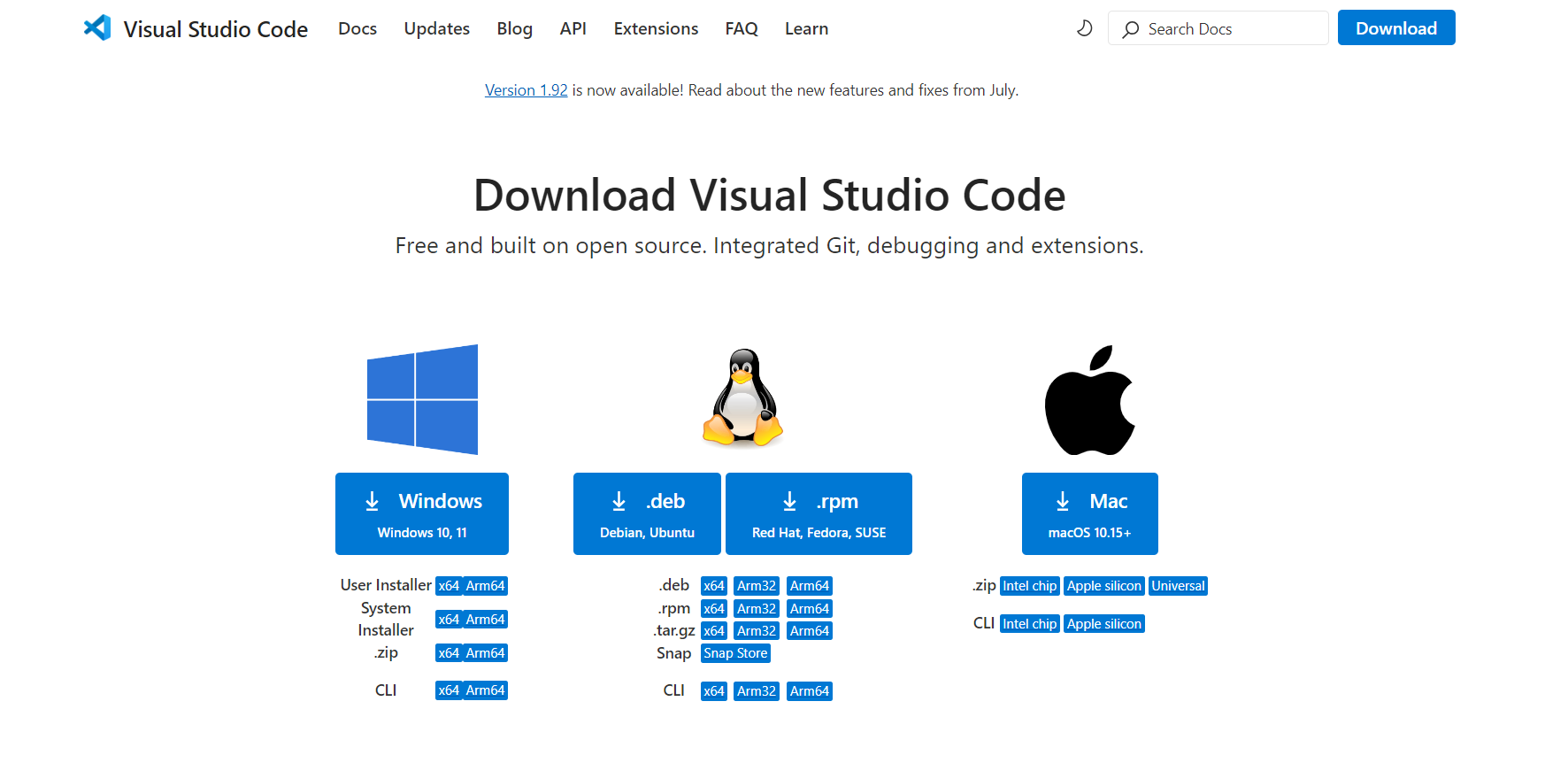前往 Visual Studio Code 下载页面,你应该会看到与下图类似的页面: